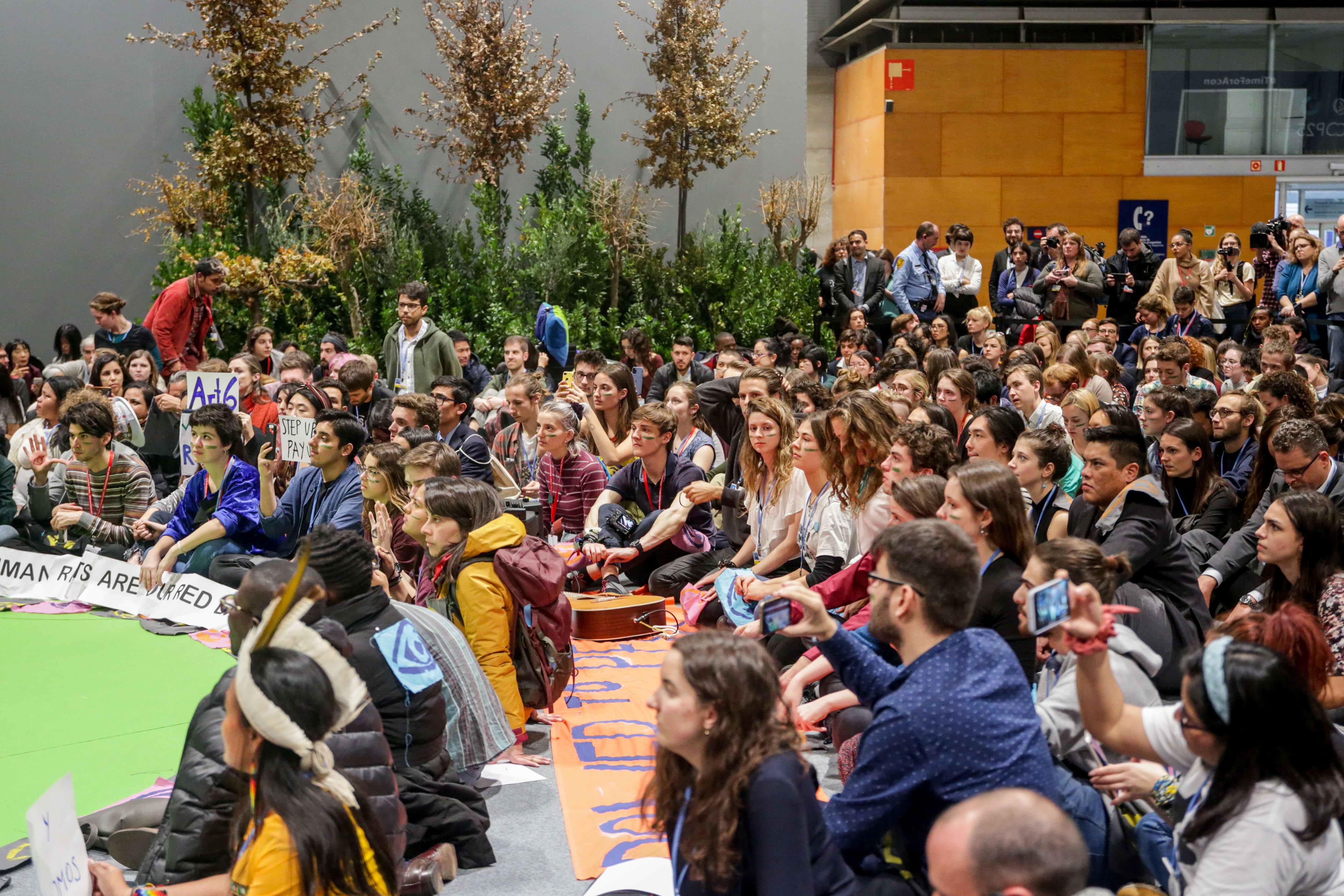 Jóvenes del movimiento Fridays for Future realizan una sentada en el pabellón 4 en protesta por los resultados "insuficientes" logrados en la Cumbre del Clima (COP25) que se celebra hasta hoy en Ifema, Madrid (España), a 13 de diciembre de 2019. 13 diciembre 2019 COP25, Medioambiente, Políticas de medioambiente, Cumbre del Clima Ricardo Rubio / Europa Press 13/12/2019